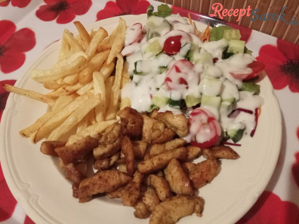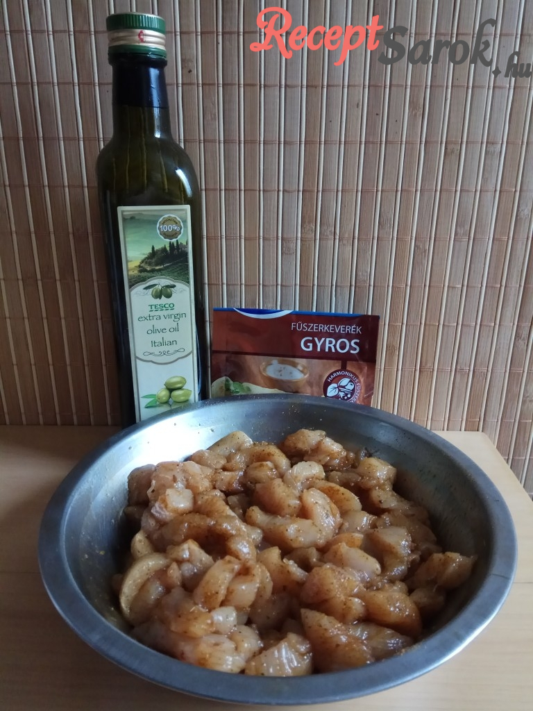 - A csirkemellet mossuk meg, vagdaljuk egyenletes darabokra, tegyük egy tálba és locsoljuk meg néhány evőkanál olívaolajjal. Szórjuk meg előre vásárolt gyros fűszerkeverékkel vagy magunk is ízesíthetjük különféle fűszerekkel. Ajánlom a fűszerpaprika, oregánó, kömény, bazsalikom, bors, kakukkfű, kurkuma, szerecsendió, koriander, rozmaring, kardamom ízlés szerinti keverékét. Az egészet jól összekeverjük és hűtőbe tesszük pihentetni legalább egy órára, de egész este is ott állhat, akkor sokkal intenzívebb íze lesz.