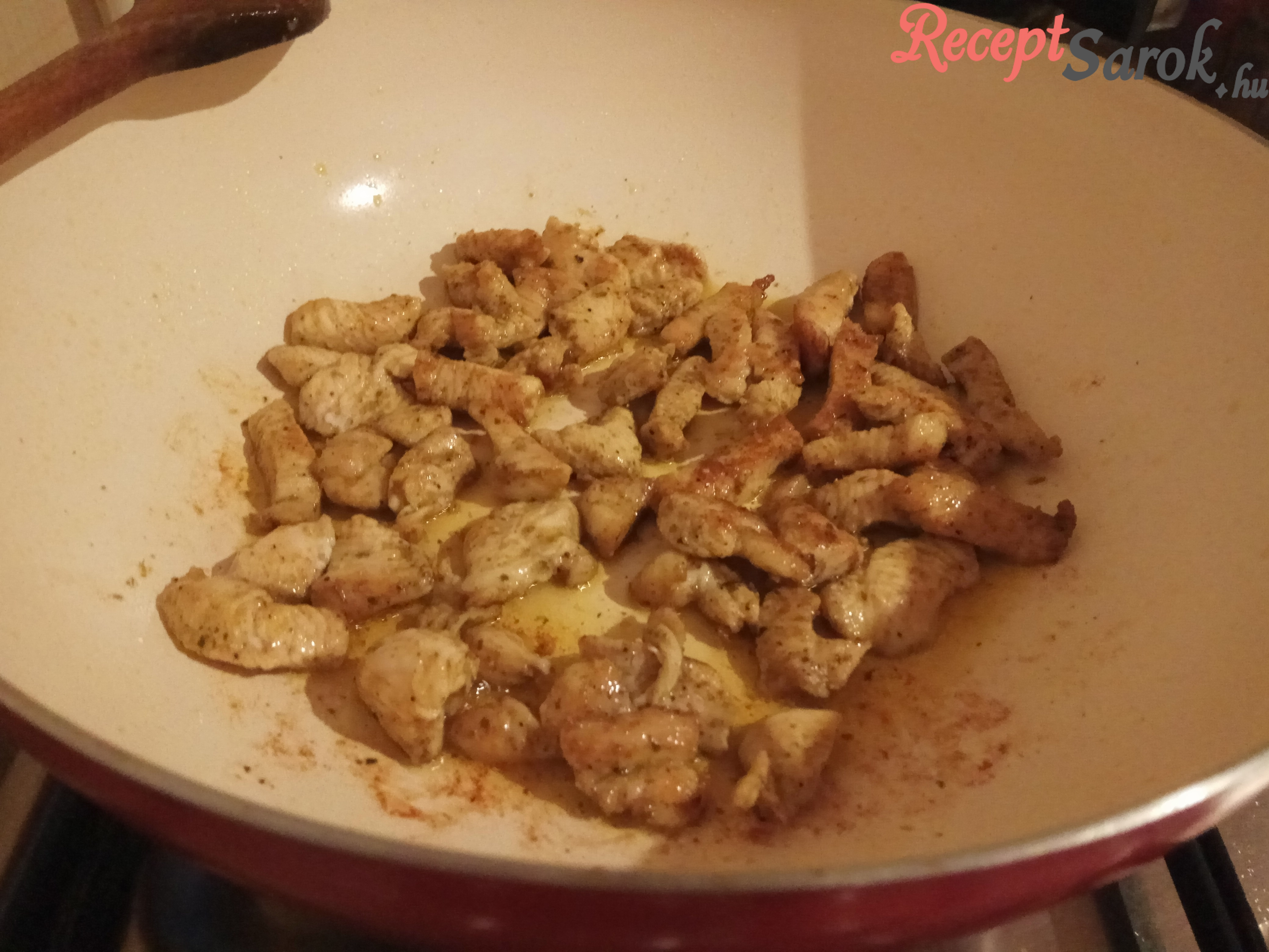 - A pihentetett fűszeres húst kevés olívaolajon egy wokban megpirítjuk. Utána vagy közben a hasábburgonyát is megsütjük.
